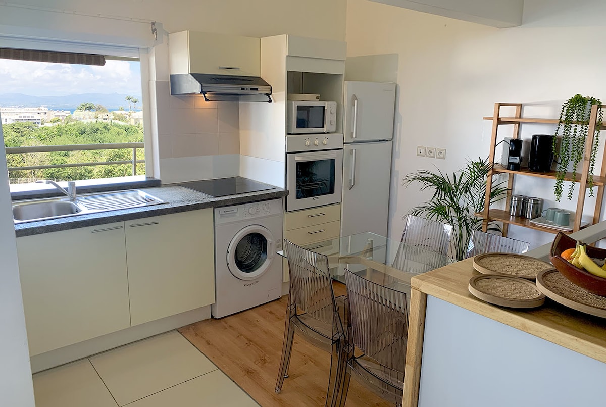 Ці апартаменти з кондиціонером мають балкон, безкоштовну приватну парковку та безкоштовний Wi-Fi. Вона включає дві спальні, вітальню, повністю мебльовану та обладнану кухню з пральною машиною та кавомашиною, а також ванну кімнату з душем. Рушники та постільна білизна включені Для додаткової конфіденційності помешкання має окремий вхід. Аеропорт Пуент-а-Пітр Ле-Разе розташований на відстані 2 км. Щоб запобігти будь-яким перебоям у водопостачанні, він має резервуар об’ємом 300 л.