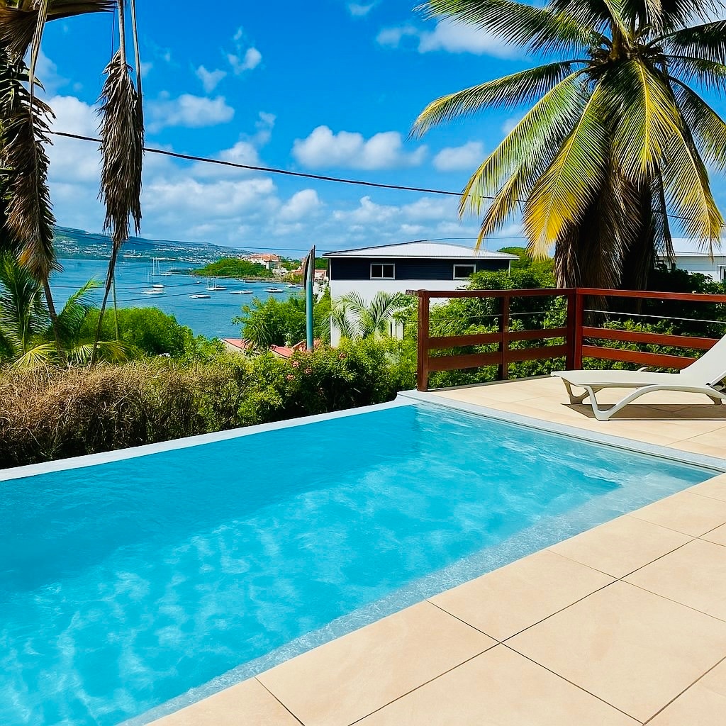 Приголомшливий вид на море над затокою Форт-де-Франс, 10 хвилин ходьби від пляжу Привілейований район Троїс - Ільєць на карибському узбережжі Ідеальне розташування для випромінювання з півночі на південь Пишний сад, панорамний басейн з підігрівом, ця дружня вілла розрахована на 10 осіб Сучасна кухня, карбет, тераси, шезлонги, барбекю, тропічний душ, туалет, підключений телевізор, Wi-Fi 4 апартаменти з кондиціонером, душовою кабіною та приватними туалетами, вид на море 1 кімната з кондиціонером