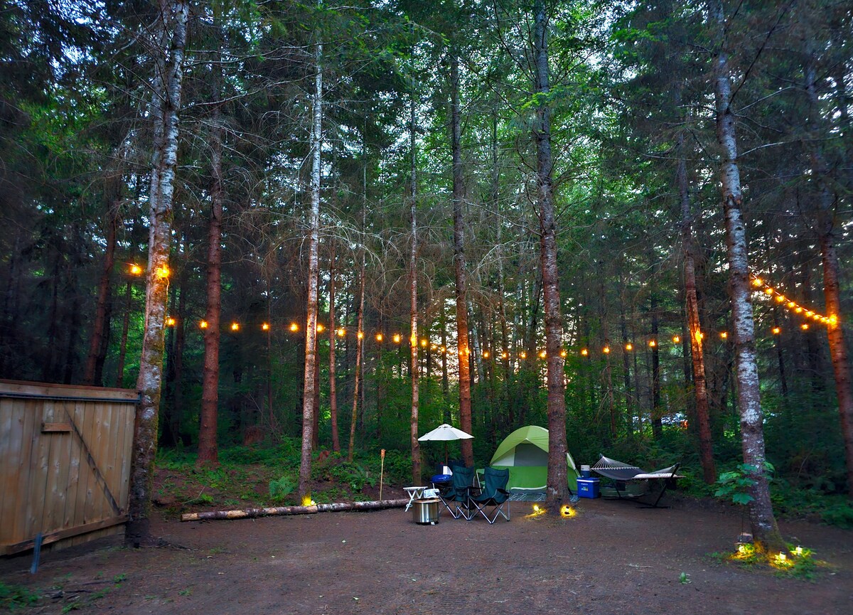 Розкшаркуйтеся в таборі класу «люкс»! 10 хвилин їзди до входу в парк Маунт-Рейнір. Ми знаходимося біля річки Ніскваллі та в декількох хвилинах від прекрасного міста Ешфорд. Ви можете насолодитися унікальним враженням у нашому глемпінг-наметі! Відокремлене приватне помешкання на території площею 26 акрів із дорослими деревами та дикою природою. Розкішне ліжко King size, міні-холодильник, кавоварка Keurig та затишний стіл на двох з іграми. Опалення за допомогою пропанового каміна в приміщенні. Після пригод вас чекає гарячий душ!