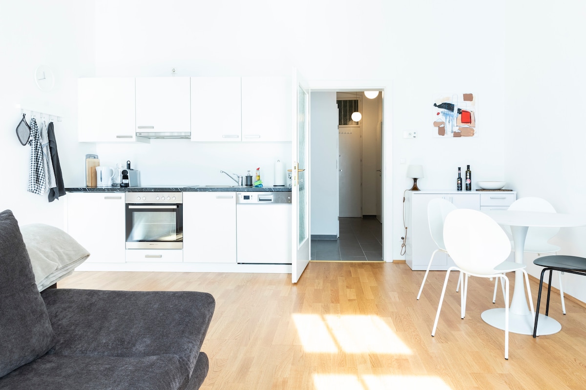 Нещодавно відремонтована стильна квартира, розташована у Французькому районі Відня, в самому центрі, в 2 хвилинах ходьби від громадського транспорту та в 7 хвилинах їзди до центру міста. Двокімнатна квартира затишна та спокійна, підходить для туристів або ділових мандрівників. Має окрему спальню з двоспальним ліжком, велику вбудовану шафу та вітальню зі зручним диваном-ліжком. Кухня добре обладнана машинами Siemens, включаючи чайник, Nespresso та інші машини. Розкішна ванна кімната дуже простора з дизайнерською ванною.