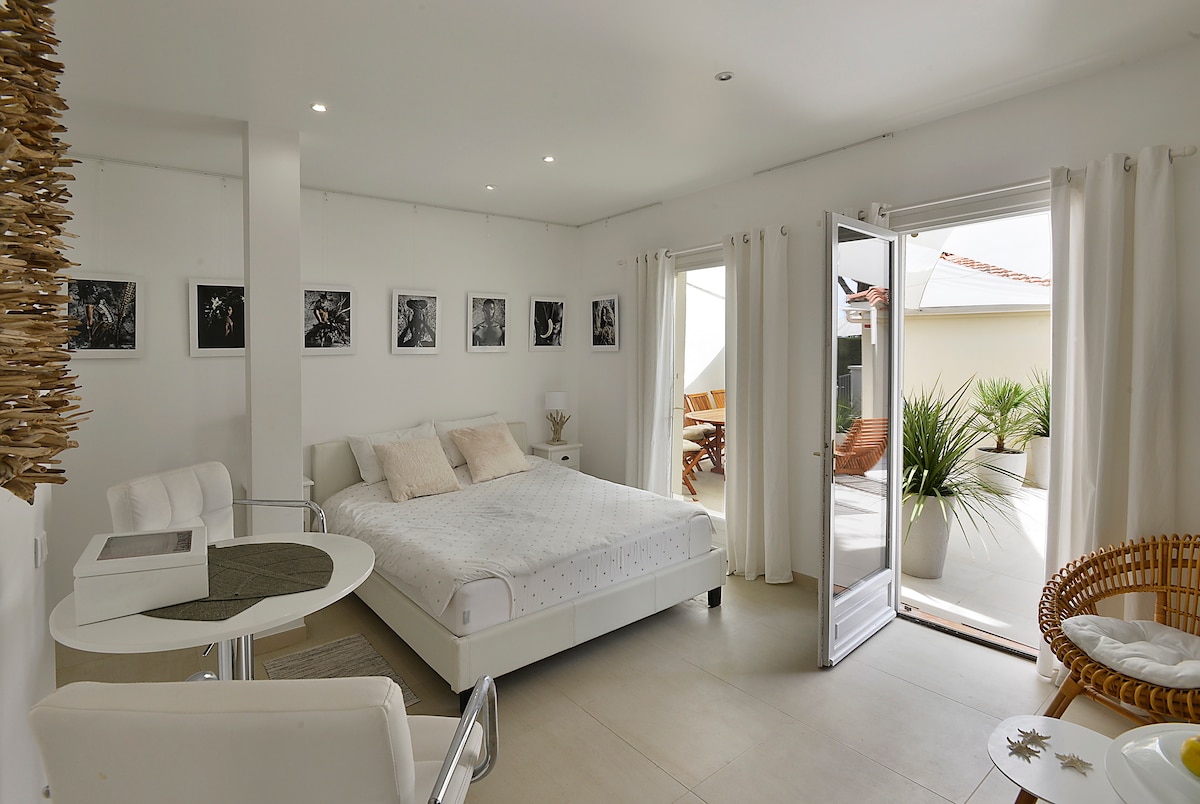 Незалежна студія на віллі для 2 дорослих і 1 дитини (антресольне ліжко), розташована в Ла-Годе, всього в 10 хвилинах від пляжів. У цій студії площею 18 кв. м є спальна зона,міні-кухня та ванна кімната . На вулиці є велика тераса, літня кухня, парасолька, сонячні ванни, спільний доступ до басейну. Для вашого автомобіля стоянка є стоянка всередині помешкання. Домашні тварини не допускаються. Оренда на тиждень з суботи по суботу або вночі.