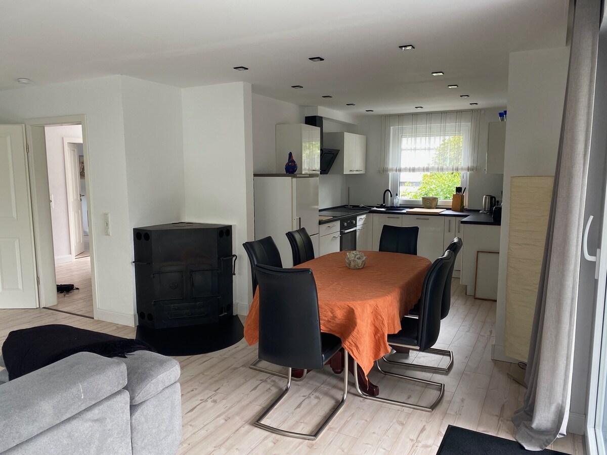 LYKKEHUS Lilienthal – дизайн і спокій поблизу Бремена Скандинавський дизайн, безліч світла та спокій. Ідеально підходить для пар або відпочинку в сільській місцевості. Ви користуватиметеся передньою частиною нашого таунхаусу з окремим входом, спальнею, вітальнею та їдальнею, кухнею, ванною кімнатою та гостьовим туалетом. Тихе розташування на Вюммевізені, багато денного світла та стабільний Wi-Fi. З нетерпінням чекаємо на ваш відпочинок у LYKKEHUS. Вера та Енн