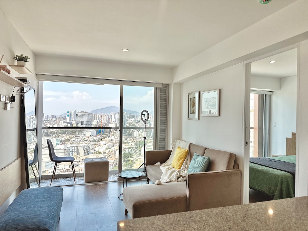 You will live a unique experience near the boardwalk, restaurants, bars, museums, art galleries and boutiques of Barranco (a district full of charm, art and tradition). It is located in the GRAU building 15, floor 18. It is a modern Loft WITH SEA VIEW that has a Queen bed, Smart TV, Kitchenette, and a fan. The building has a swimming pool, gym, coworking and laundry that you can use during your stay.
