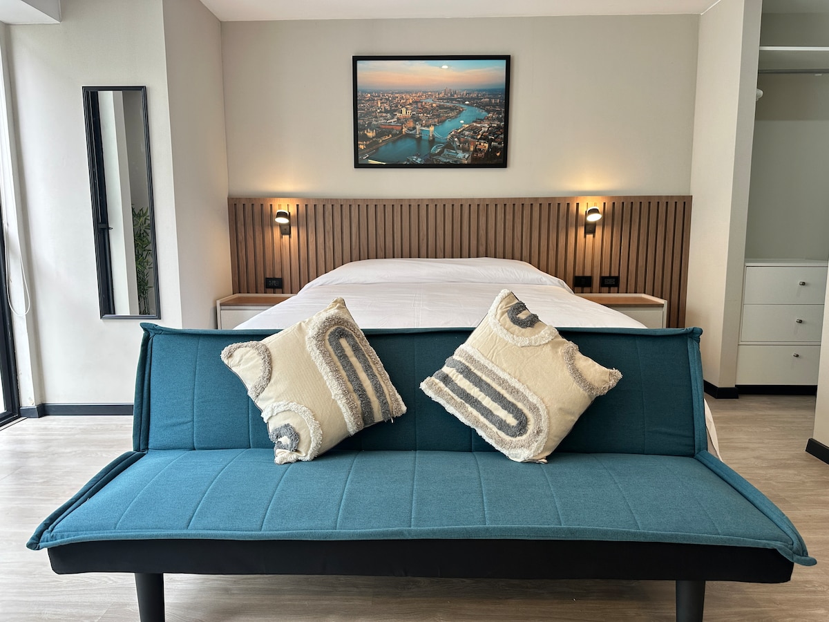 Красива квартира на просп. Салаверрі біля Сан-Ісидро, Реаль-Плаза, університети, клініки та посольства. Зручний доступ до історичного центру, Кампо-де-Марте, парку Magic Water, Національного стадіону та Мірафлореса. Включає вітальню-їдальню, гостьову ванну кімнату, кухню, спальню з ванною кімнатою, пральню та балкон. Повністю обладнана, Wi-Fi (400 Мбіт/с), Smart TV у вітальні та спальні. Тренажерний зал і басейн у будівлі. Ідеально підходить для роботи або відпочинку, для пар або сімей – ви почуватиметеся як удома.