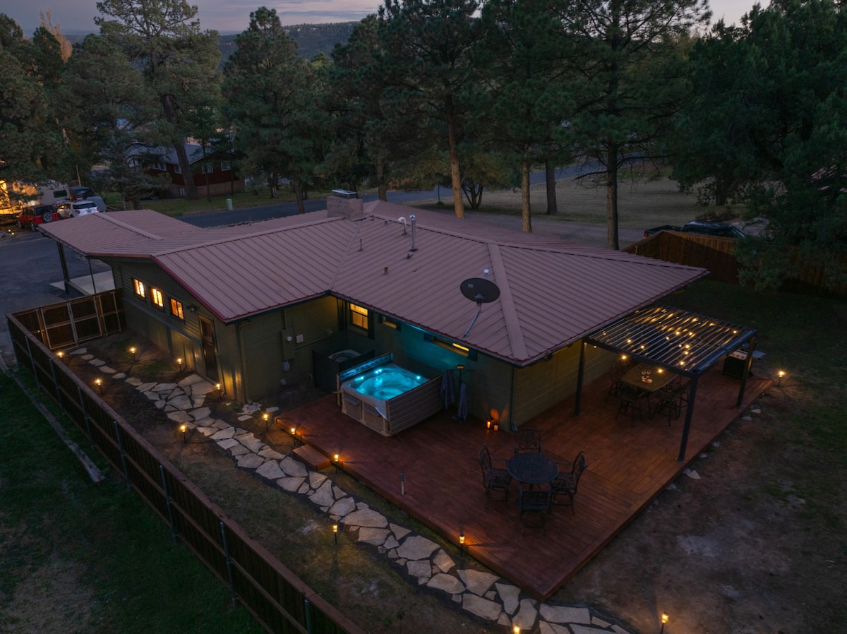 Bear Luck Lodge - це затишний зруб у Руїдозо! Цей будинок початкового рівня має відкритий план поверху з кам 'яним каміном, склепінчастими стелями та легким доступом до просторої тераси з гідромасажною ванною. Насолоджуйтеся дивовижними краєвидами та великою кількістю дикої природи! З трьома королями, 1 королевою, футоном і 2 спальними диванами, тут легко розміститися 13 осіб. Ідеальне розташування поблизу озера Гріндстоун, Inn of the Mountain Gods, магазинів, ресторанів, стежок тощо! У Руїдозо є щось для кожного цілий рік. Bear Luck Lodge - ідеальний гірський будиночок.
