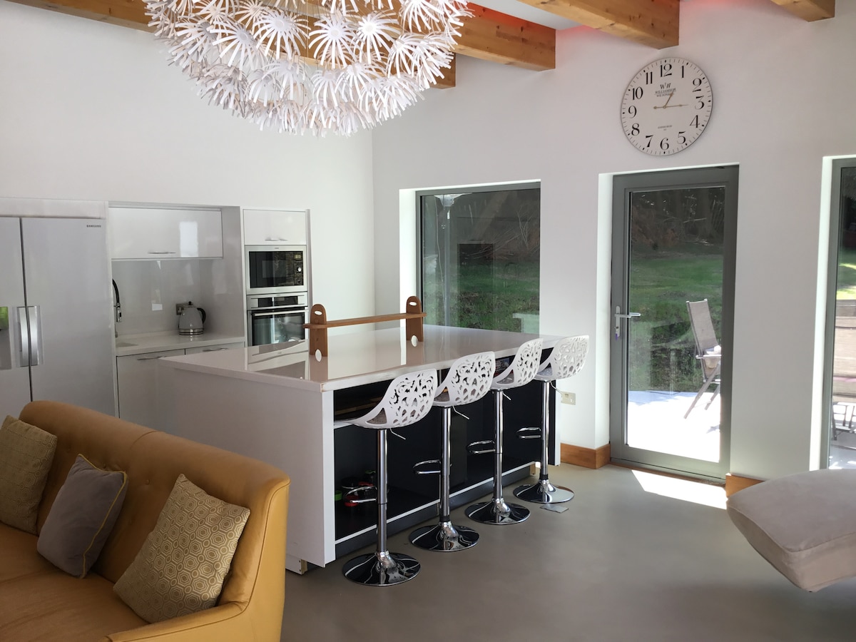Ця унікальна самостійна будівля, спроектована архітектором, має свій стиль. З міні-кухнею відкритої плани та острівною квартирою, включаючи духовку, мікрохвильову піч, варильну поверхню та холодильник із морозильною камерою, ви можете пообідати або вийти на ринок Пітерсфілд. У зоні відпочинку є 72-дюймовий телевізор із повним пакетом «небо» та запасними ведучими HDMI. У душовій вологої кімнати є прогулянка та окремий гардероб. Спальня затишна, з ліжком розміру «king size». Для маленьких дітей є окрема зона з двоспальними ліжками.