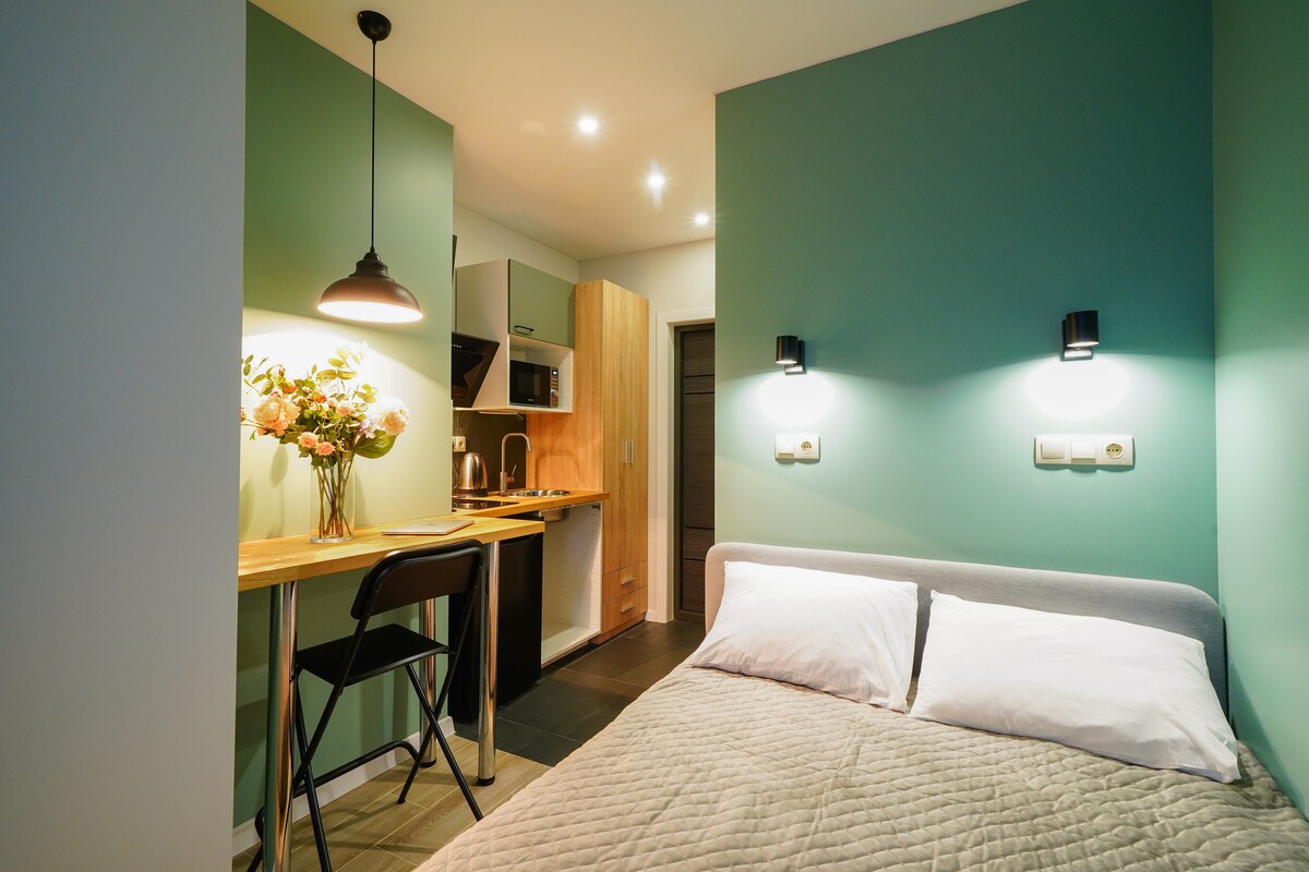 Затишна, невелика, комфортна дворівнева студія-лофт розташована на 4 поверсі історичної будівлі, побудованої в 1917 році, що знаходиться в центрі Києва, недалеко від Оперного театру та вулиці Хрещатик. Станція метро «Університет» знаходиться поруч, в 5 хвилинах ходьби. Ця квартира є частиною невеликого апарт-готелю на 6 номерів. Всередині квартири є двоспальне ліжко розміру «king size» і високоякісні матраци на антресолі. Студія має власну невелику кухню і власну ванну кімнату з усім необхідним.