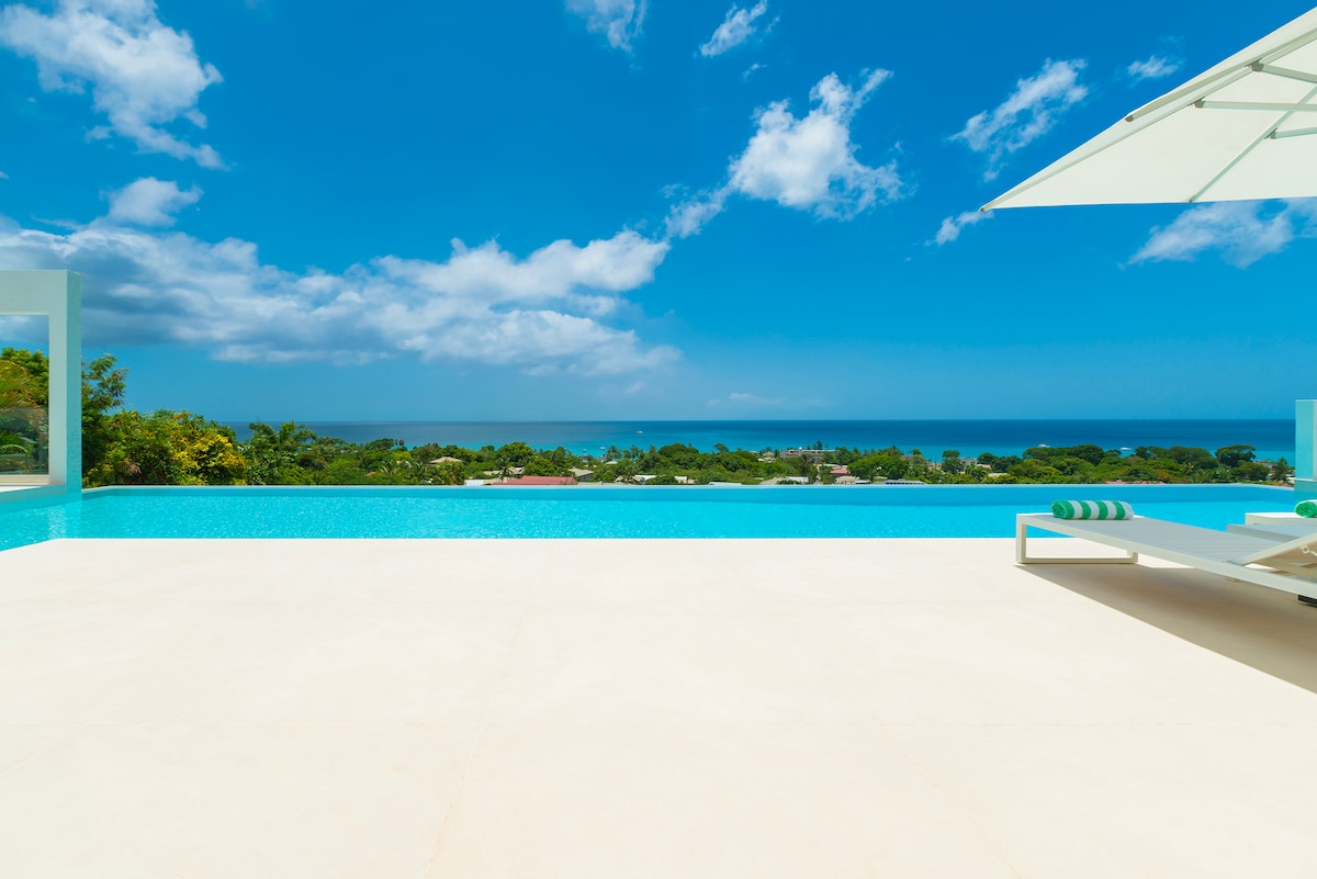 Marsh Mellow is a custom-designed villa situated on a ridge overlooking the West Coast of Barbados and the sparkling Caribbean Sea. Uniquely designed in a half-moon crescent shape with ivy-covered Italian-style columns and arches, this fabulous holiday villa offers guests the wonder of enjoying panoramic ocean views from every room. The central entryway leads into the open-air living room, which overlooks the garden, fountain, infinity-edge pool, and then on to the ocean beyond.