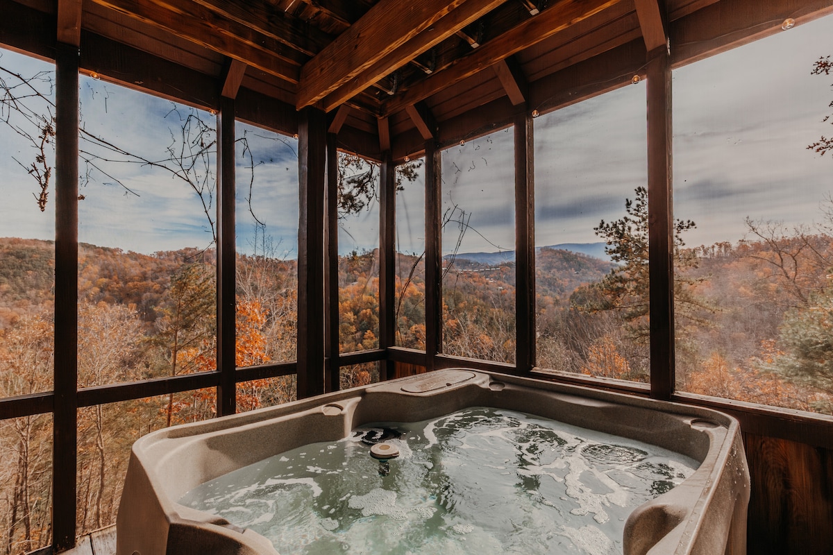 Ваша елегантна гірська пригода чекає на вас! Хребет Авалон - це захоплюючий приватний, сучасний зруб, розташований високо в Смокі-Маунтинс, з неймовірними краєвидами! У просторій спальні є кам 'яний камін і розкішна ванна, лісовий лофт оточений старовинною деревиною, а вікна від підлоги до стелі демонструють краєвид з будь-якої точки зрубу! Насолоджуйтеся сходом сонця зі сніданку або розслабтеся в розкішній гідромасажній ванні. Забронюйте цей відпочинок на вершині гори вже сьогодні!