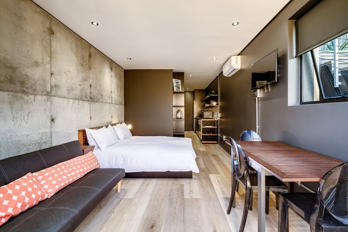 Our studio apartment opens up onto a 40sq meter balcony with a panoramic view of the Hout Bay Valley and the Helderberg mountains beyond. Large sliding doors disappear into the walls creating an unimpeded indoor/outdoor flow while the elevated position protects your privacy. The open plan bathroom faces onto an enclosed secret garden which includes a frame-less glass shower. The unit has a fully equipped kitchenette and is serviced daily except weekends and public holidays.