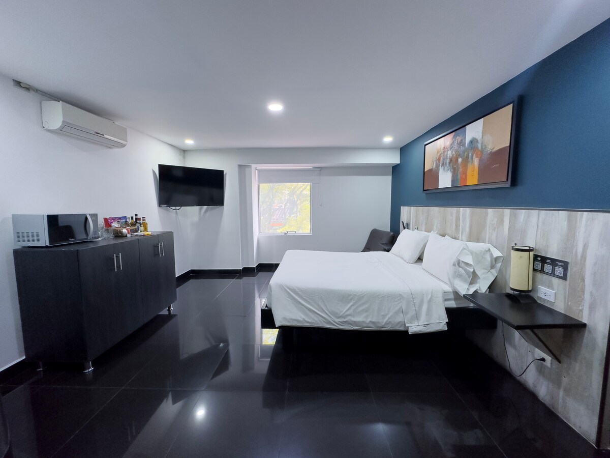 Це місце не можна пропустити. У нас є 1 спальня, 1 ванна кімната з джакузі. Повністю обладнана концепція відкритої кухні. Високі стелі. Сучасний світлий декор і 55-дюймовий HD-телевізор. Цей готель ідеально розташований в 2 кварталах від парку Ллерас. У декількох хвилинах ходьби від найкращих ресторанів Медельїна, таких як Кармен, Ель-Сіело та Ханамі. Якщо ви хочете бути в центрі події, де місцеві жителі тусуються, це місце для вас. Усе необхідне знаходиться в декількох кроках.