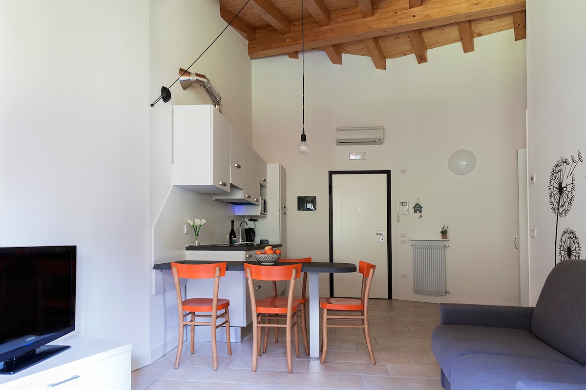 Хороша квартира з кондиціонером, пральною машиною та деяким зовнішнім простором. 100 метрів від автобусної зупинки та магазину, де продають свіжі фрукти та овочі та щоденні продукти. Якщо вас цікавить місцева їжа та вина, ми можемо дати вам кілька порад щодо сусідніх магазинів і ферм. Великий супермаркет відкритий на 7/7 менше ніж за 10 хвилин (пішки). Замок міста (на пагорбах Просекко) знаходиться в 20 хвилинах ходьби. Ми живемо поруч, розмовляємо італійською, але сини допомагають нам приймати іноземних гостей.