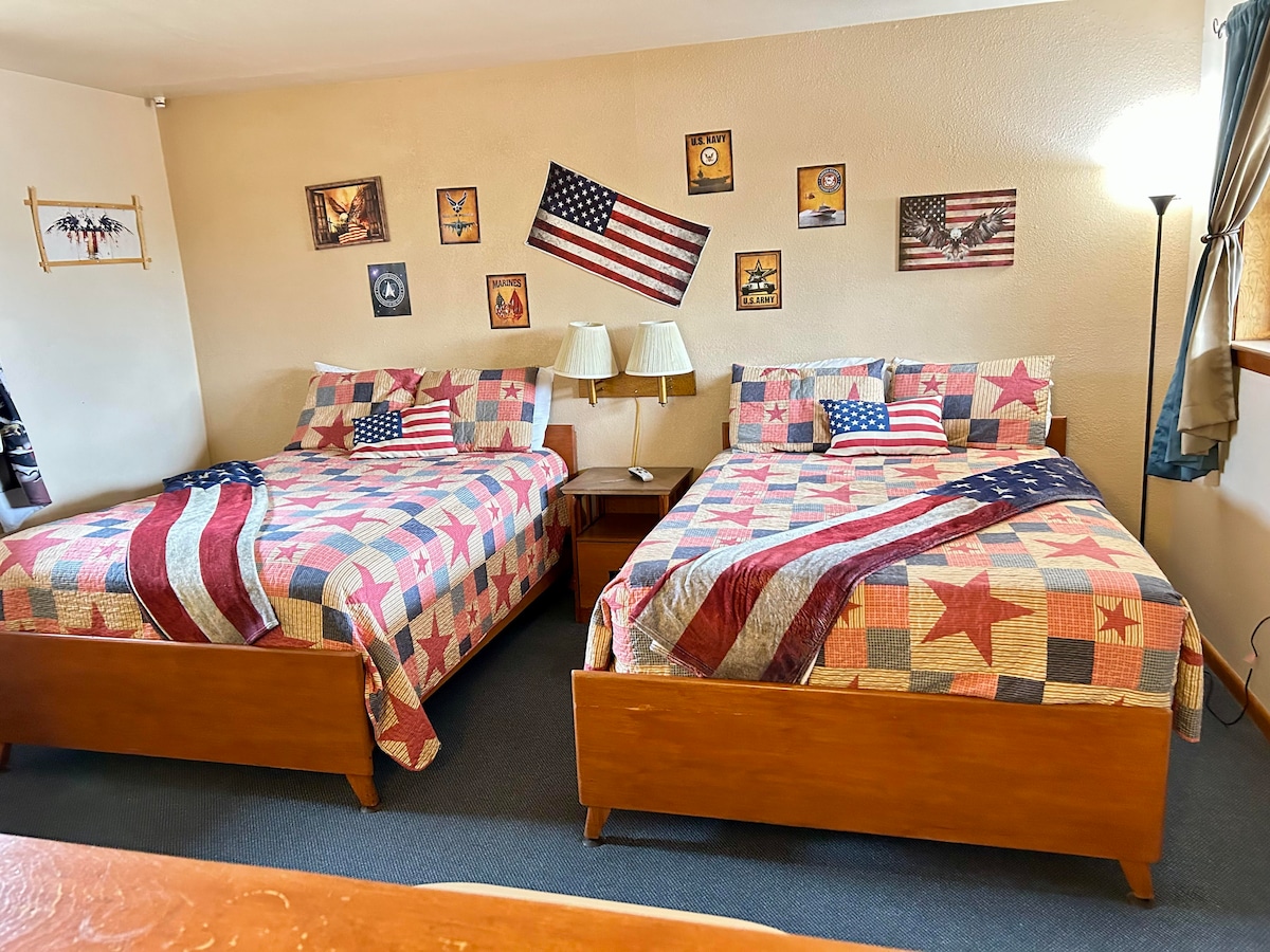 Welcome to the Armed Forces room, paying homage to all who have served in the Armed Forces to keep our great nation safe, and promoting democracy around the world. Featuring 2 Queen beds, Cable TV with loads of channels, kitchenette with 12-cup coffee maker, mini fridge and microwave.