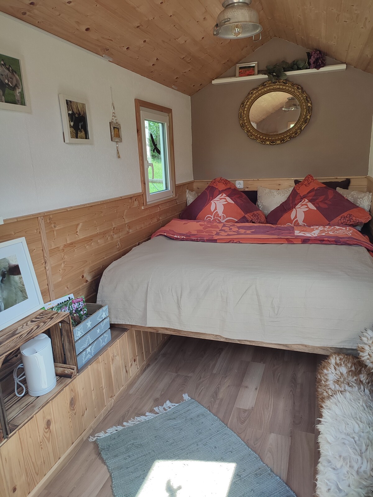Дерев 'яний будинок площею 13 кв. м посеред нашого великого саду з міні-кухнею, дерев' яною плитою, пухким туалетом та сонячною енергією. Є 2 ліжка, які можна розмістити у вигляді двомісних або одномісних ліжок. Зберігайте простоту, без телевізора та Wi-Fi, але з достатньою кількістю СПОКОЮ та ПРИРОДИ. У саду є сонячний свінг, камін і тіпі (влітку). Будинок знаходиться на відстані 30 м, є душова кімната, якою можна користуватися з 7: 30 до 22: 00 і куди можна висадити брудний посуд.
