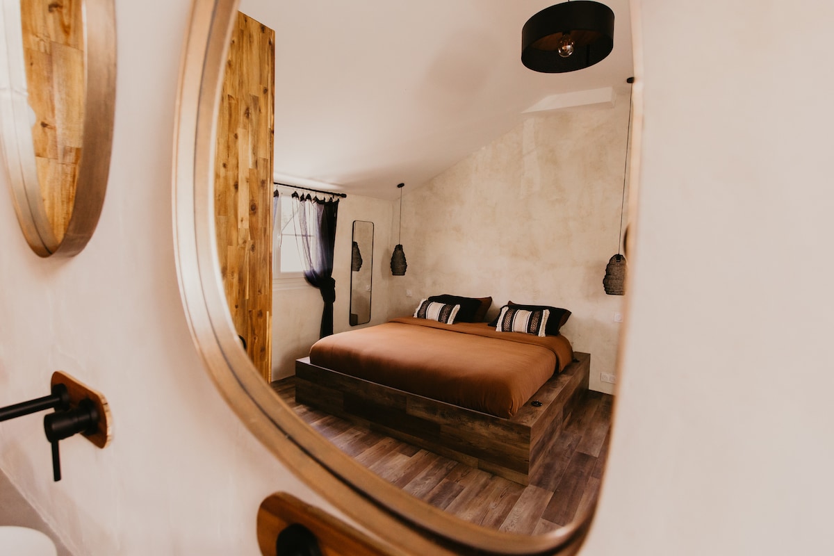 Я уявляв для вас в одній з наших господарських будівель - унікальне місце, де розслаблення, веселощі та романтика змішатимуться. Залиште вільний відпочинок під час перебування протягом однієї ночі або більше в повному усамітненні в цьому люксі з масажним столом і приватною гідромасажною ванною. Щоб зробити ваше перебування ще приємнішим, я пропоную доповнення, сніданок, сирну дошку або раклет, пакет заходів AMOUR або BOHEME. Не соромтеся!