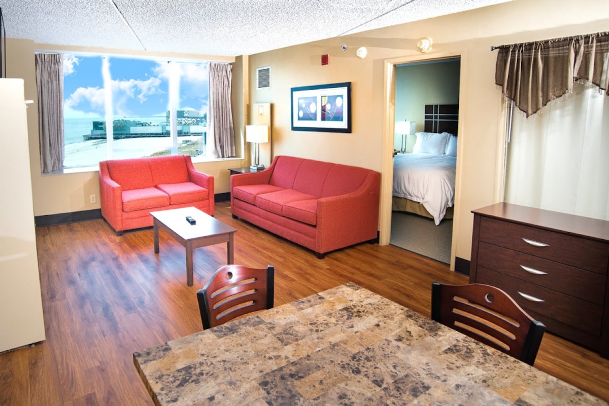 Ocean front studio with amazing views all the way down the beach. Watch sunrise over the ocean, sun by the third floor pool, walk right out the front door onto the world famous boardwalk... Just steps away from all the nightlife, food, sun, and casinos make our ocean front studio your home in Atlantic City. We provide a cook top, microwave, and dorm fridge so you can save some money by cooking in or reheating, while easily stepping out to the one of the dozens of amazing restaurants nearby.