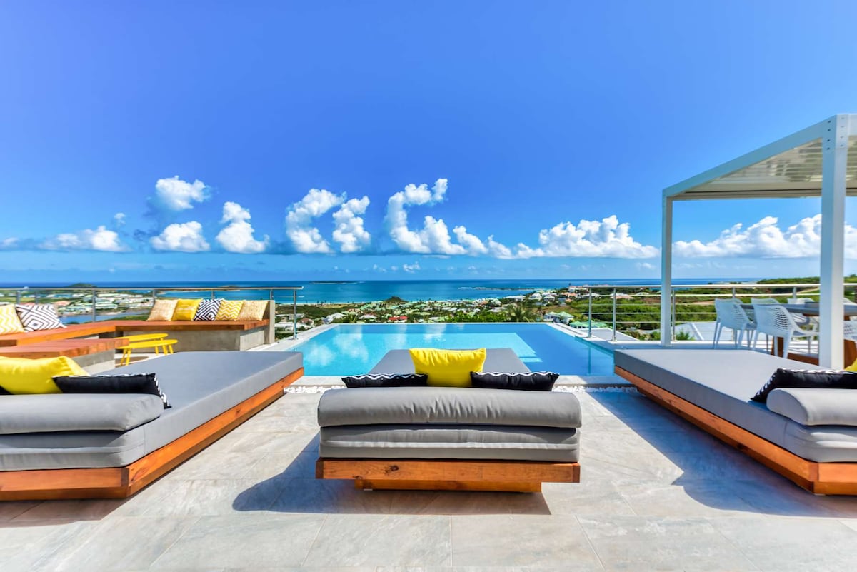 Overlooking the turquoise waters of Orient Bay and the islands of Pinel and Tintamarre, Villa Topaze is a modern and contemporary 3-bedroom property. Villa Topaze features rooms that are accessible from the inside, air conditioning throughout the property, and a well-equipped gym with a view. The perfect villa to spend vacations with family or friends on the island of St Martin. Villa Topaze can be rented with Villa Turquoze to make 7 rooms.
