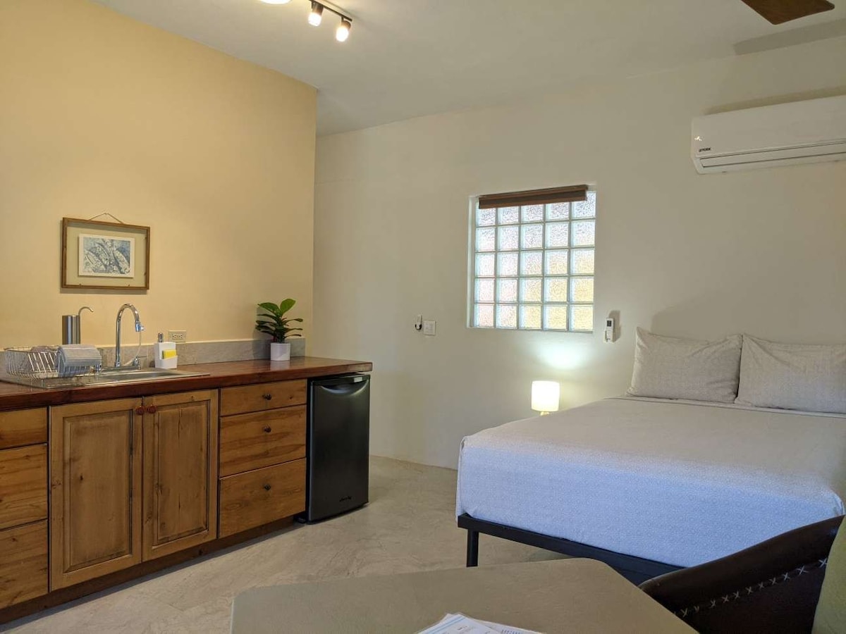 Автономне бунгало-студія на сонячних батареях розташоване в центрі міста, поруч із дайв-центрами, ресторанами та пляжем. Воно може вмістити до трьох осіб, є великий диван-ліжко. Цей блок не призначений для дітей віком до 10 років. Кондиціонер працює обмежено і може працювати до 12 годин на добу, включаючи нічний час, а в хмарні дні може працювати ще менше. Паркування доступне для невеликих транспортних засобів і є спільним із Casa Verde, який розташований перед Casa Mexicana. Ціна за ніч вказана для 2 гостей.