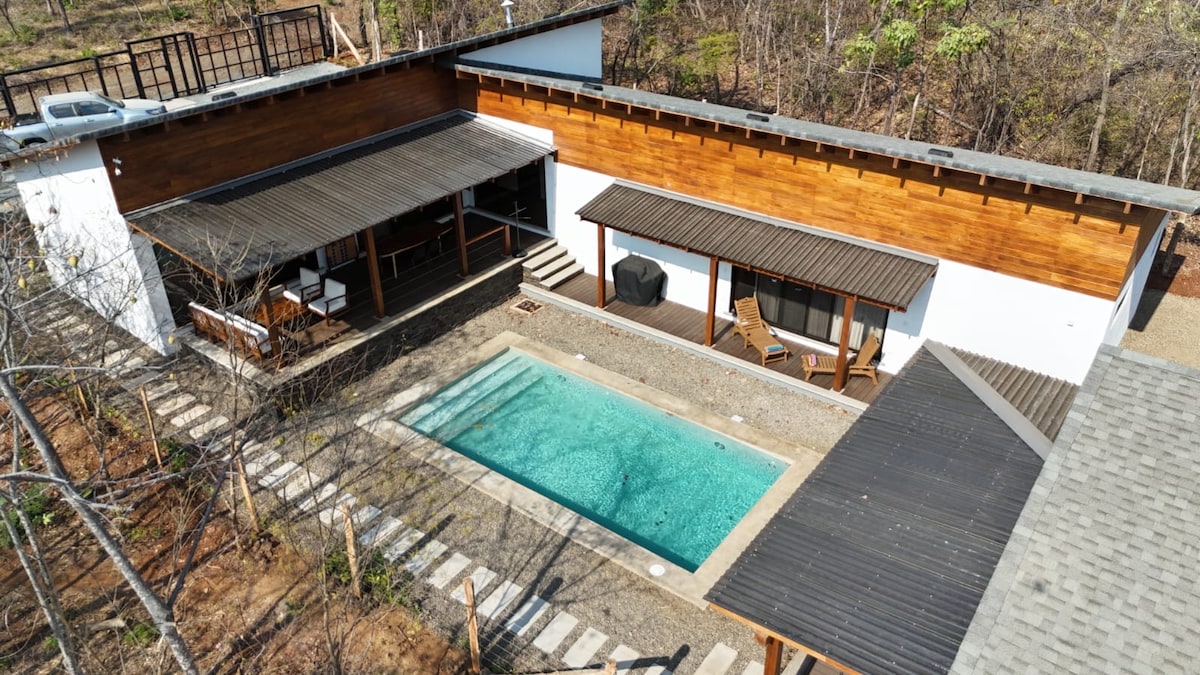 З ContainerHomes -plus ми розробили гармонійну концепцію з прекрасною архітектурою. Меблі та двері з дерева гуанакасте доповнюють вигляд. Будинки, які просто змушують вас почуватися добре. Незалежно від того, чи ви вирішите орендувати наш будинок із 1 спальнею або будинок із 2 спальнями, ви не лише будете вражені якостями. Басейн розташований між двома гостьовими будинками. Найкращий Інтернет. Тихе місце. Вид на долину та пагорби. 100 м висотою. 9 хвилин до пляжу. Хороша гарантія!