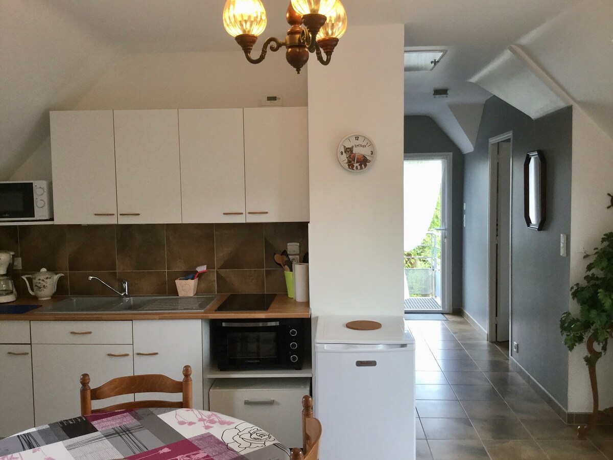 Відпочиньте в цьому тихому помешканні на вихідних. працівники, VRP . Оснащена кухня зі склокерамічною плитою, холодильником, морозильною камерою, мікрохвильовою піччю та духовкою. Сніданок за запитом Вітальня: диван-ліжко, телевізор, безкоштовний Wi-Fi. Незалежний вхід зі сходів зі скляним дахом, ванна кімната з душем 90x90, раковина на шафі, сушарка для рушників туалет із самообслуговуванням. Зовнішні садові меблі у дворі, зарезервованому для гостей . Барбекю, Чудова прогулянка