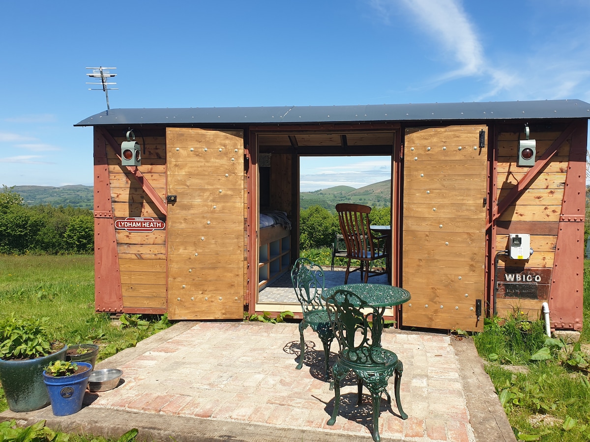Lydham Heath Railway Carriage is at The Foxholes Campsite. The view is special, looking out towards the stunning views of the Stiperstones, LongMynd and beyond. The carriage is 50m from the shropshire way footpath, ideal for walkers looking to make the most of the South Shropshire hills. The Railway Carriage sleeps two, with a king sized bed and is dog friendly. Basic facilities; cold water tap, double induction hob, Airfryer, fridge/freezer, TV and electric heater.