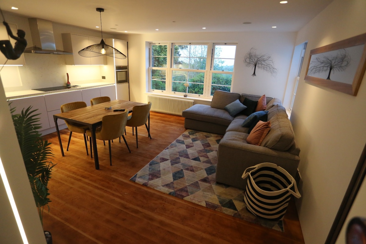 Яскрава та простора квартира в центрі Фалмута з приголомшливим видом на лимани. Тут є повністю відкрита кухня, їдальня та вітальня, добре обладнана усім необхідним для подорожі. Включає всі звичайні прилади та телевізор Smart TV з об 'ємним звуком. Можна розмістити до 4 осіб з головною спальнею з власною ванною кімнатою та двоспальним диваном-ліжком у вітальні. Велика тераса зі столиками на вулиці - ідеальне місце для насолоди панорамним краєвидом! Безкоштовна приватна парковка для одного автомобіля.