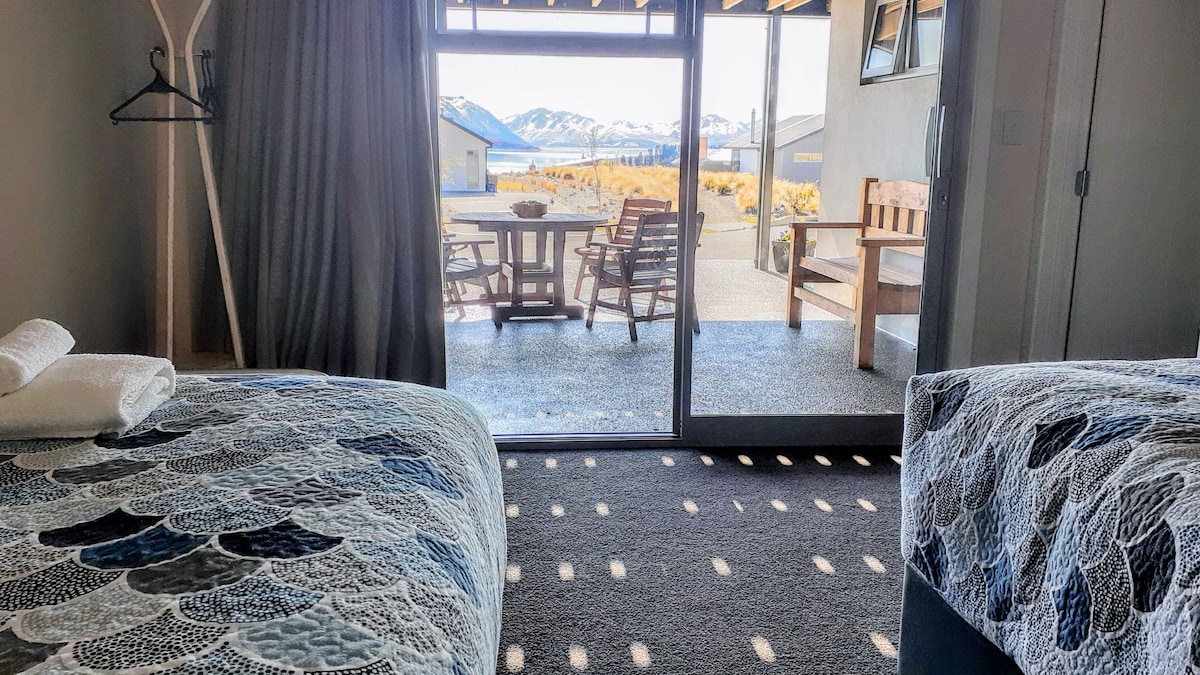Sunset Chalet - це затишне шале з однією спальнею, автономне з ванною кімнатою, душем та міні-кухнею. Одне зручне ліжко queen-size, патіо /тераса та сидіння. Ідеально підходить для пари. Лише в декількох хвилинах ходьби від центру міста, магазинів, барів і ресторанів, а також від церкви Доброго пастуха, озера Текапо, статуї собаки та пішохідного мосту. Спільний газон і сад із котеджем із видом на озеро на березі річки Текапо, з якого відкривається чудовий вид на озеро Текапо. Майже всі наші гості люблять те, що є.