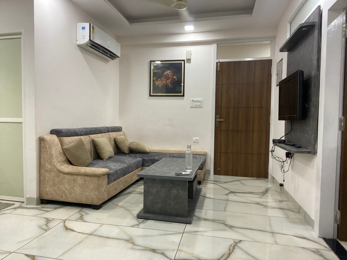 Насолоджуйтеся нашим повністю мебльованим затишним помешканням 2 BHK (2 красиві спальні, зал/вітальня та кухня) з: Особливості кухні - Повністю обладнано для самостійного приготування їжі. - Надається вся необхідна побутова техніка та посуд. - Ідеально підходить для приготування їжі та їжі. - Холодильник. - Очищувач води/RO - Гейзер Комфорт, розваги та зручність - 1 великий 56-дюймовий LED-телевізор Smart TV - Музична/звукова система - 1 кондиціонер із 2 вентиляторами у вітальні - Диван-ліжко у вітальні - Безкоштовний Wi-Fi. Spiritual Corner-Mandir/Pooja ghar
