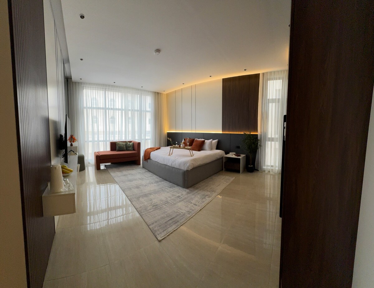 Розкішна майстер-студія, яка містить: • Зручне ліжко Master для забезпечення спокійного сну. • Елегантна зона відпочинку з зручним диваном. • Телевізор високої чіткості для насолоди від перегляду. • Кафельний куточок для приготування гарячих напоїв. • Готова кухня. • Власний санвузол, обладнаний усім необхідним: шампунем, милом та гелем для ванни для повного комфорту. Місця поблизу: Мавзолей Пророка Мухаммеда менше 10 хвилин Станція метро Аль-Харамін менше 10 хвилин Аеропорт принца Мухаммеда бін Абдул-Азіза менше 15 хвилин