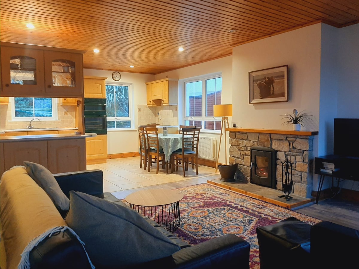 Розслабтеся в нашому автентичному зрубі відкритого планування. Приходьте відпочити, розслабитися та розслабитися в центрі Gonegal Gaeltacht. Насолоджуйтеся приголомшливим видом на гори Севен-Сістер, відпочиваючи в гідромасажній ванні, халатах і тапочках. Всього в 3 хвилинах їзди від пляжу Магероарті, де ви можете скористатися екскурсіями по острову та поромними сполученнями до місцевих островів. Національний парк Гленві, гори Еррігал і Мучіш, лісопарк Ардс і винокурня Croilthlí знаходяться в 30 хвилинах їзди.