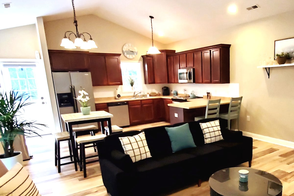 Чудово розташований на фермі McDaniel Pine Farm у Уейді, Північна Кароліна, ви почуватиметеся як удома в котеджі Bluff. Студія з ліжком queen-size та 2 стільцями, які перетворюються на зручні односпальні ліжка. Також є надувний матрац. Зручна вітальня з великим телевізором із плоским екраном і спеціальним робочим місцем для робочого столу. Окрема ванна кімната, душова кабіна та невелика кухня з гарячою тарілкою, сковорідками, кавоваркою, мікрохвильовою піччю та холодильником. Гарне патіо на вулиці з вогнищем і гектарами!