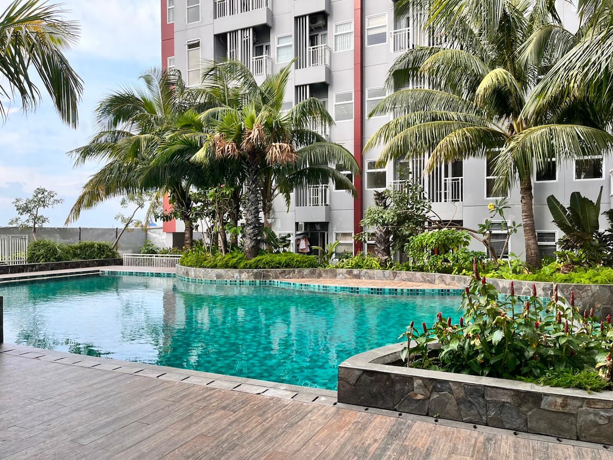 Простора та стильна квартира площею 34 м² з 1 ліжком King Size (180 x 200), 1 односпальним ліжком (100 x 200) та диваном-ліжком, який може вмістити сім 'ю або групу від 4 до 5 осіб. Цей апартамент розташований на 37-му поверсі, має прямий вид на басейн і чудовий вид на прекрасне місто Макассар. У багатоквартирному будинку є цілодобова охорона, зона спільного користування, фітнес-центр і кілька басейнів. Розслабтеся, розслабтеся та насолоджуйтеся перебуванням.