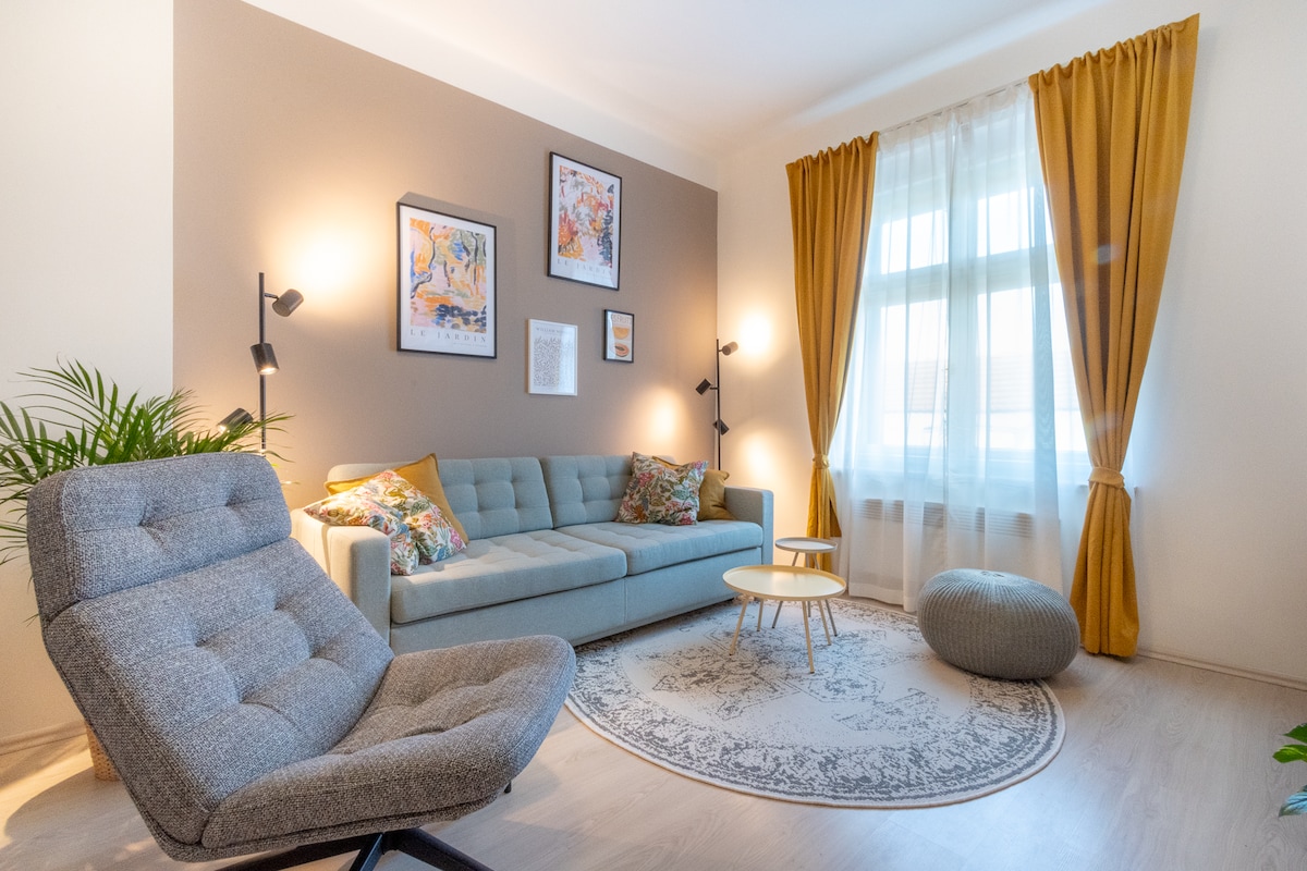 Відпочиньте з книгою на довгому декоративному шезлонгі, а через величезні вікна цієї центральної будівлі XV століття проникають сонячні промені. Відпочиньте на зручному кутовому дивані й насолодіться сумішшю вишуканих меблів того часу та розкішних нейтральних тканин. Квартира знаходиться між двома головними площами: Староместською площею та Вацлавською площею з кутовим видом на театр The Estates. Він також знаходиться поблизу головної центральної станції метро «Мустек».