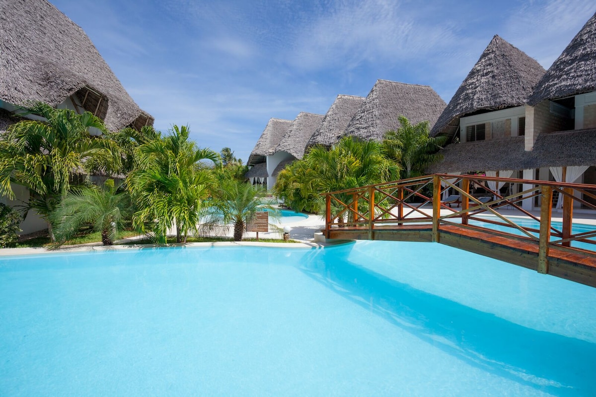 Відкрийте для себе нашу яскраву афро-богемську віллу в Малінді – помешкання з 3 спальнями та 6 ліжками в закритому житловому комплексі. Насолоджуйтеся приватним басейном, просторим патіо та пишним садом. Кожна кімната з ванною кімнатою оснащена кондиціонером і вентиляторами, а головна кімната примикає до дитячої кімнати. Розслабтеся в лаундже з 55-дюймовим смарт-телевізором і потужним Wi-Fi. Повністю обладнана кухня, їдальня в приміщенні/на відкритому повітрі, безкоштовна парковка та цілодобова енергія на сонячних батареях - це ваш ідеальний відпочинок. Всього в 5 хвилинах від міста та в 15 хвилинах від аеропорту.