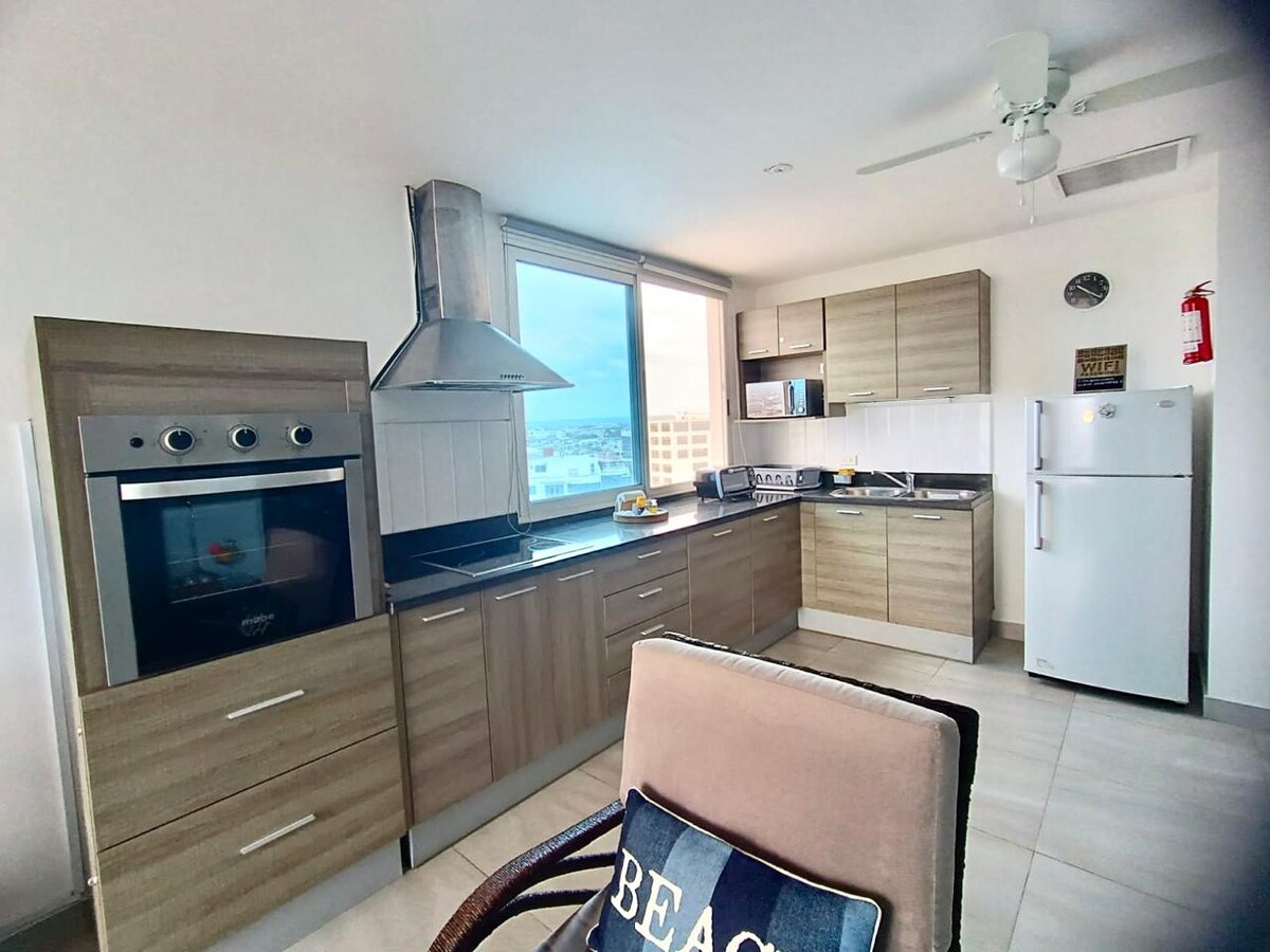 Виняткова знахідка перед морем! Гостюйте в найкращому районі Манта з прямим доступом до пляжу Мурсьелаго та торгового центру Pacific Mall. Насолодіться унікальним декором у пляжному стилі та відчуттям океану, які ідеально підходять для відпочинку та релаксації. Насолоджуйтеся басейном, джакузі, сауною та цілодобовою охороною. Усе, що потрібно для незабутнього перебування, - тут. Вам тут так сподобається, що ви не захочете їхати!