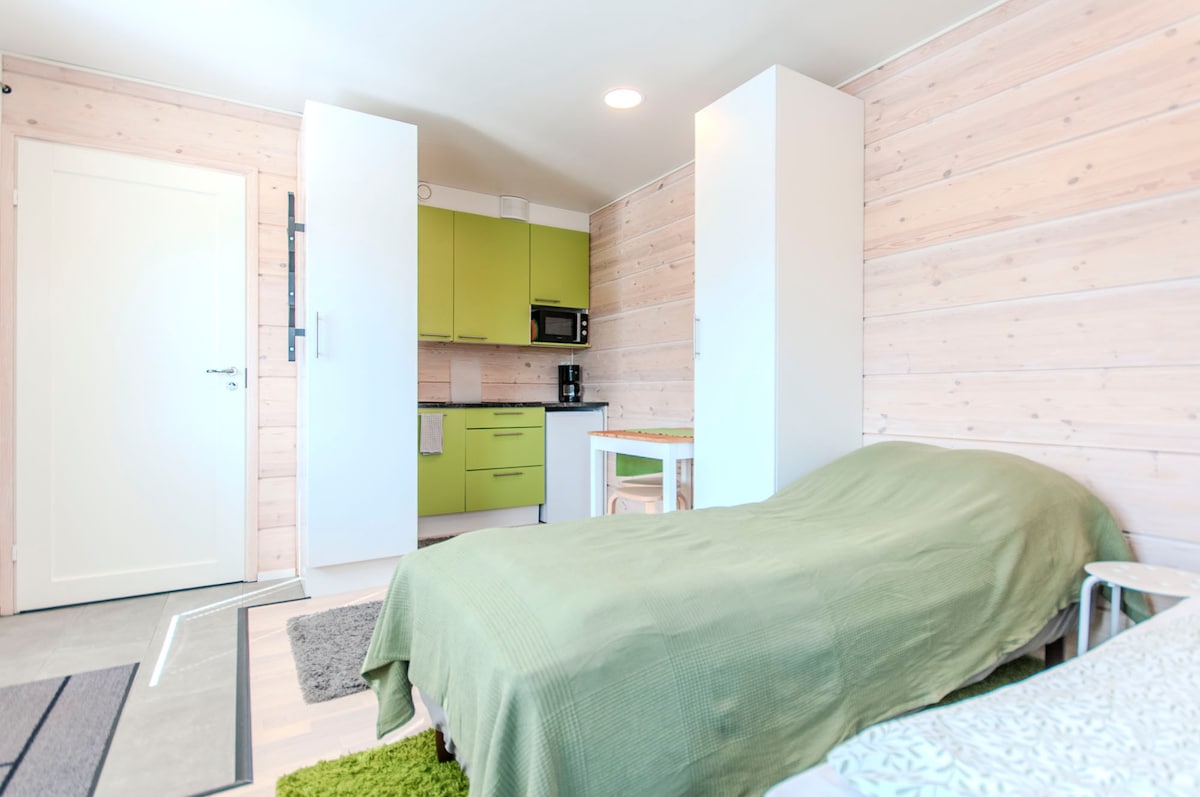 У квартирі є велика кухня-вітальня з усіма новими машинами та побутовою технікою. Індукційна плита, духовка, мікрохвильова піч, посудомийна машина, вода та кавоварка, а також повний набір посуду. Вітальня/спальня з плюшевим двоспальним ліжком, диваном-ліжком в ніші. Можна знайти 55-дюймовий телевізор Elisa Entertainment і Netflix. Душова кімната/ туалет з пральною машиною. Паркувальне місце у дворі та столик на вулиці та гриль влітку.