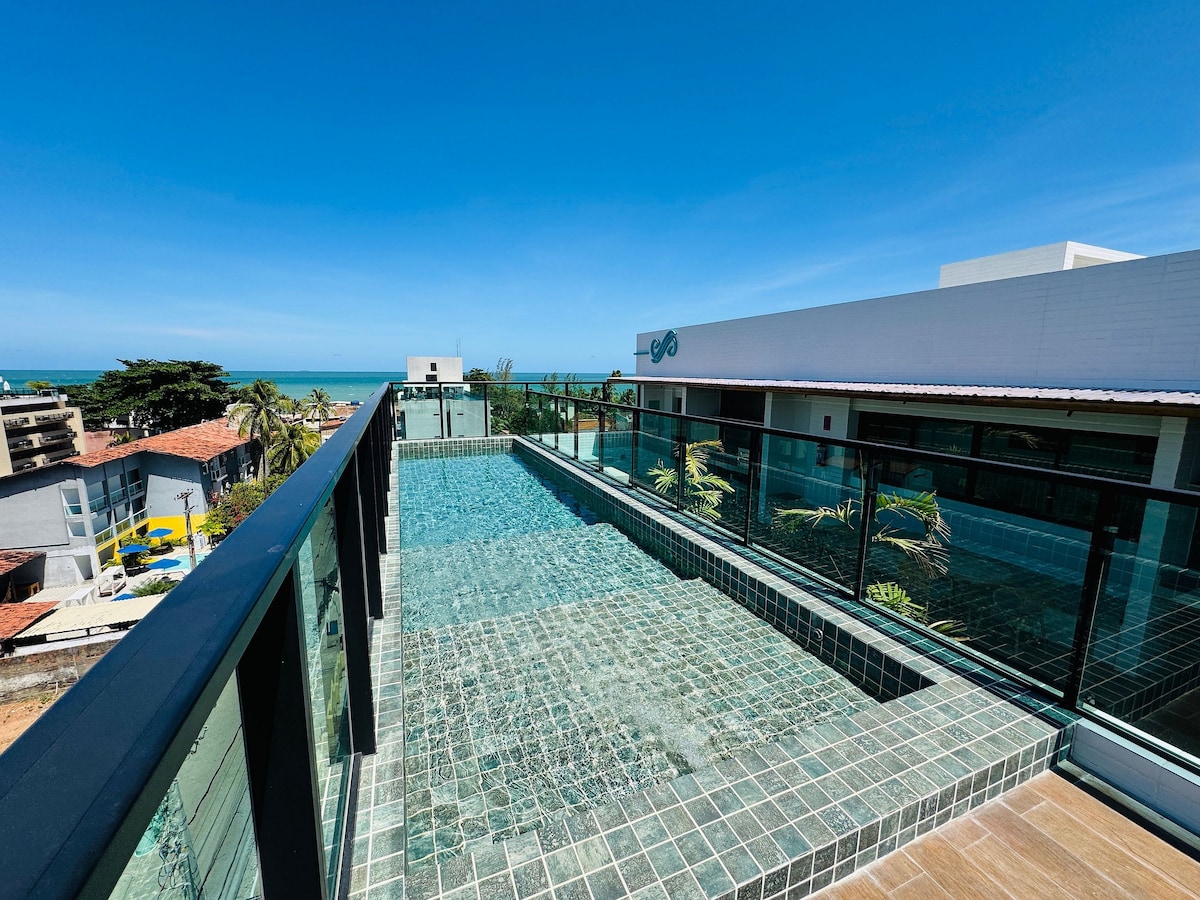 Квартира затишна, з американською кухнею, вітальнею з диваном-ліжком, кондиціонером, смарт-телевізором, балконом та спальнею з двоспальним ліжком, кондиціонером та шафою Кухня з усім посудом, мікрохвильовою піччю, блендером, сендвіч-мейкером, фригоба, кавоваркою та аерофритюрницею Енховал Душ із газовим підігрівом Wi-Fi Зона відпочинку на даху з дзеркалом води, видом на море, басейном для дорослих і дітей на заході сонця Maraca Beach II розташований за 50 м від пляжу, з ліфтом, цілодобовим консьєржем і доступом також до Beira Mar