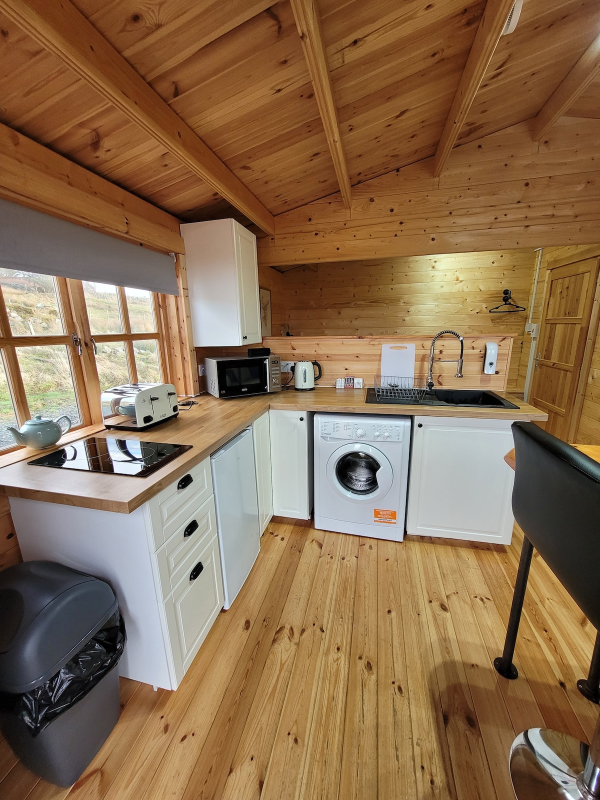 The Wee Wooden Yurt at Caolas Gallery — це оригінальний дерев’яний круглий будинок із зеленим дахом і панорамними вікнами, з яких відкривається безперервний вид на море до острова Скалпей та Південно-Східного Гарріса. До зручностей належать центральне купольне вікно на даху, ванна кімната, кухня, зручні стільці та дров’яна піч, і, звичайно, двоспальне ліжко. Помешкання розташоване на південній стороні, має багато природного освітлення, добре ізольоване, тепле та затишне