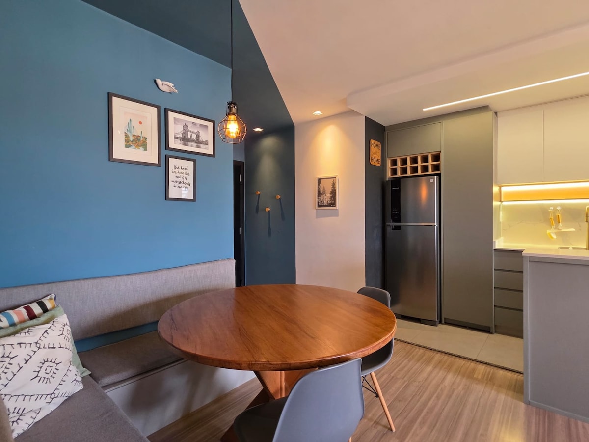 Квартира без центру, високий стандарт і повна - 1 паркувальне місце; - 3 спальні з кондиціонером; - Інтернет; - телевізор Smart c/ Netflix; Кухня обладнана усім посудом у ідеальному стані; - Постільна та банна та банна білизна. — Ліжечко (перевірте вільні дати) Гнучкий час прибуття/виїзду з цілодобовим консьєржем. Відмінне розташування: поруч із Віллі Девідсом, Mercadão Municipal та супермаркетом На 10-му поверсі, 3 ліфти. Вікна та балкони з захисним екраном для дітей Ми приймаємо домашніх тварин 🐶