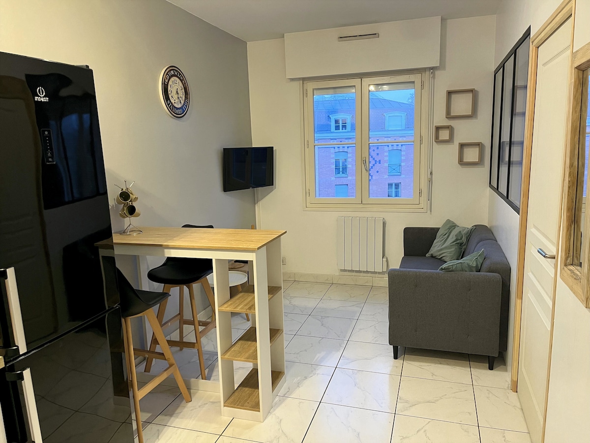 - Сучасна та дизайнерська тиха квартира розташована в 2 хвилинах від центру міста та магазинів, в 10 хвилинах ходьби від залізничного вокзалу Камбрай. - Повністю відремонтований з усіма зручностями з Wi-Fi. - Повністю обладнана відкрита кухня з американським холодильником, посудомийною машиною. - Ванна кімната з душем та ванною. - Спальня, обладнана ліжком розміру King size, шафою та телевізором. - пральня з пральною машиною - Туалет - Диван-ліжко. - Надаються постільна білизна, рушники та мочалки! - Un cafteriere Senseo
