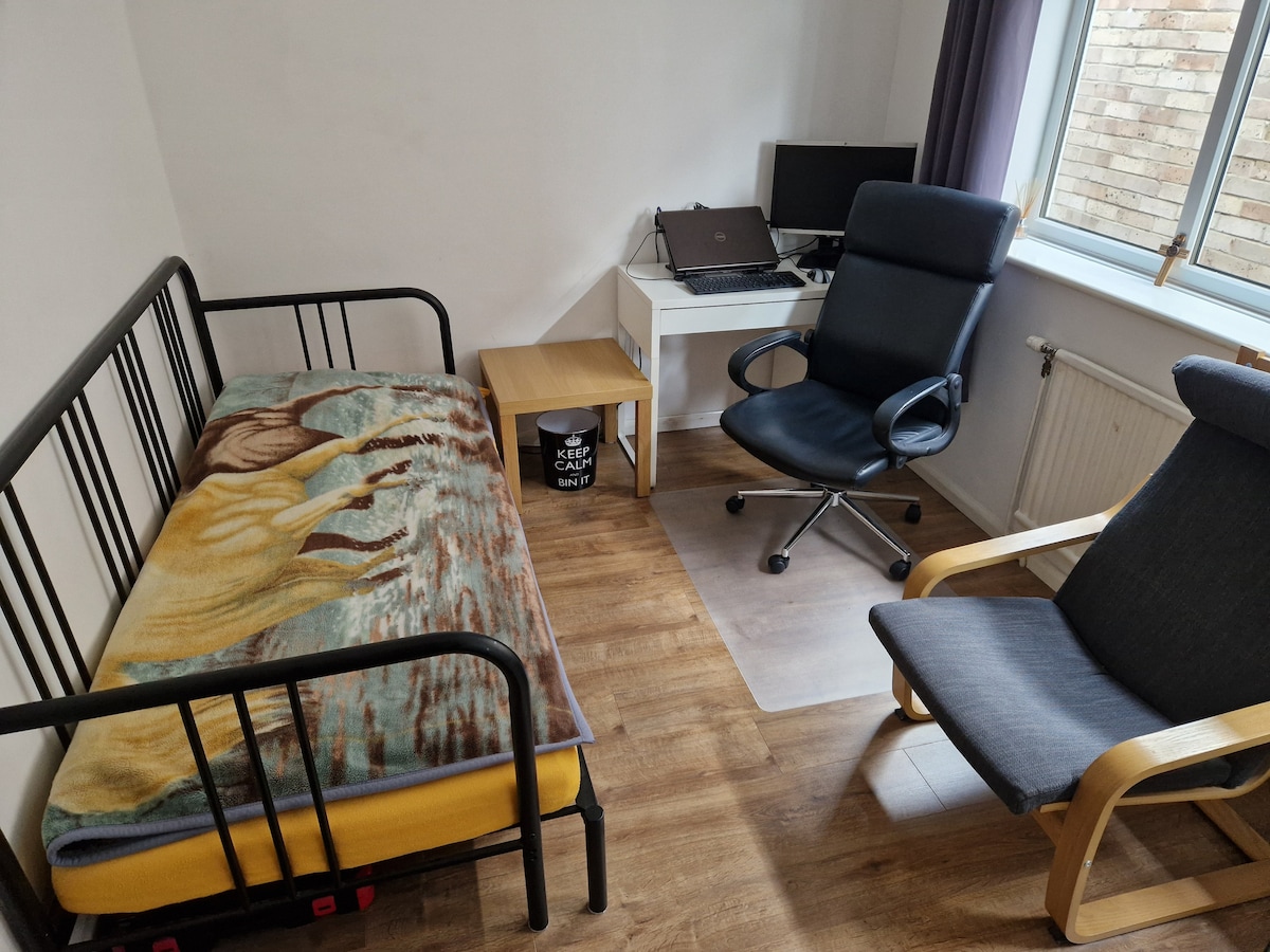 Ласкаво просимо до моєї однієї спальні, яка сучасно оформлена на першому поверсі. Спальня з ліжком king-size, туалетом і відкритою ванною, а також чайною зоною - все це для вас. Будинок ідеально розташований в затишній зоні та забезпечує легкий доступ до серця Оксфорда, лікарні Джона Редклиффа. Є одна безкоштовна парковка на бездоріжжі. Правила дому: гучність має бути знижена з 22:30 до 7:00, щоб мінімізувати порушення для інших. Водяні труби можуть бути гучними. Строго заборонено проводити вечірки або заходи.