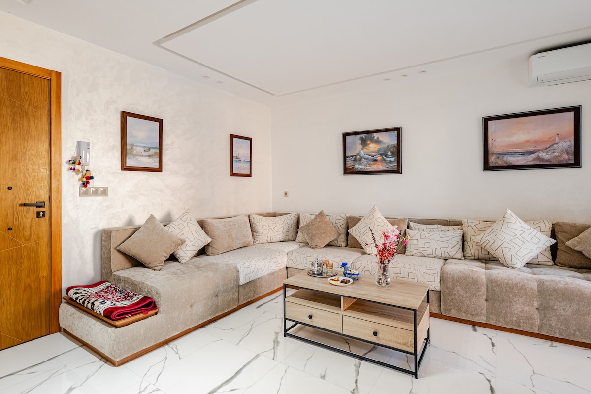 🏟️ Can 2025⚽️, майже за годину їзди від великого стадіону IBN BATOUTA,приходьте і відкрийте для себе цю виняткову подію 🔥. 📍 Квартира 🏡 202 на рівні саду🪴, вид на басейн, тиха будівля з ліфтом. 4 🏖️ хвилини 🚙 від пляжу Мартіл. 9 ✈️ хвилин 🚙 від аеропорту Sania R 'el в Тетуані. М 'якість, розташована в Факультетському районі. Тут кожна деталь була розроблена, щоб надати вам поєднання спокою та елегантності.