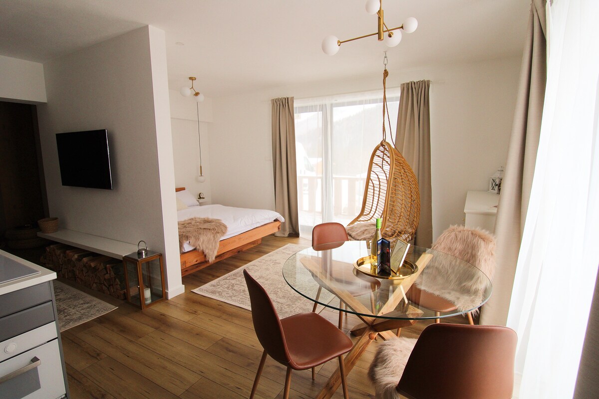Запрошую вас до сучасної однокімнатної квартири, яка розташована всього в 9 хвилинах ходьби від головної площі в Мартіні. Повністю обладнана, з обладнаною кухнею, базовими засобами для приготування їжі та прання. Двомісне ліжко для комфортного сну, смарт-телевізор та Wi-Fi. Лоджія з видом на Малу Фатру. Безкоштовне паркування прямо перед багатоквартирним будинком, а весь центр міста знаходиться в пішій доступності. Квартира ідеально підходить для індивідуальних подорожуючих, пар або бізнес-мандрівників, які шукають житло в Турці.