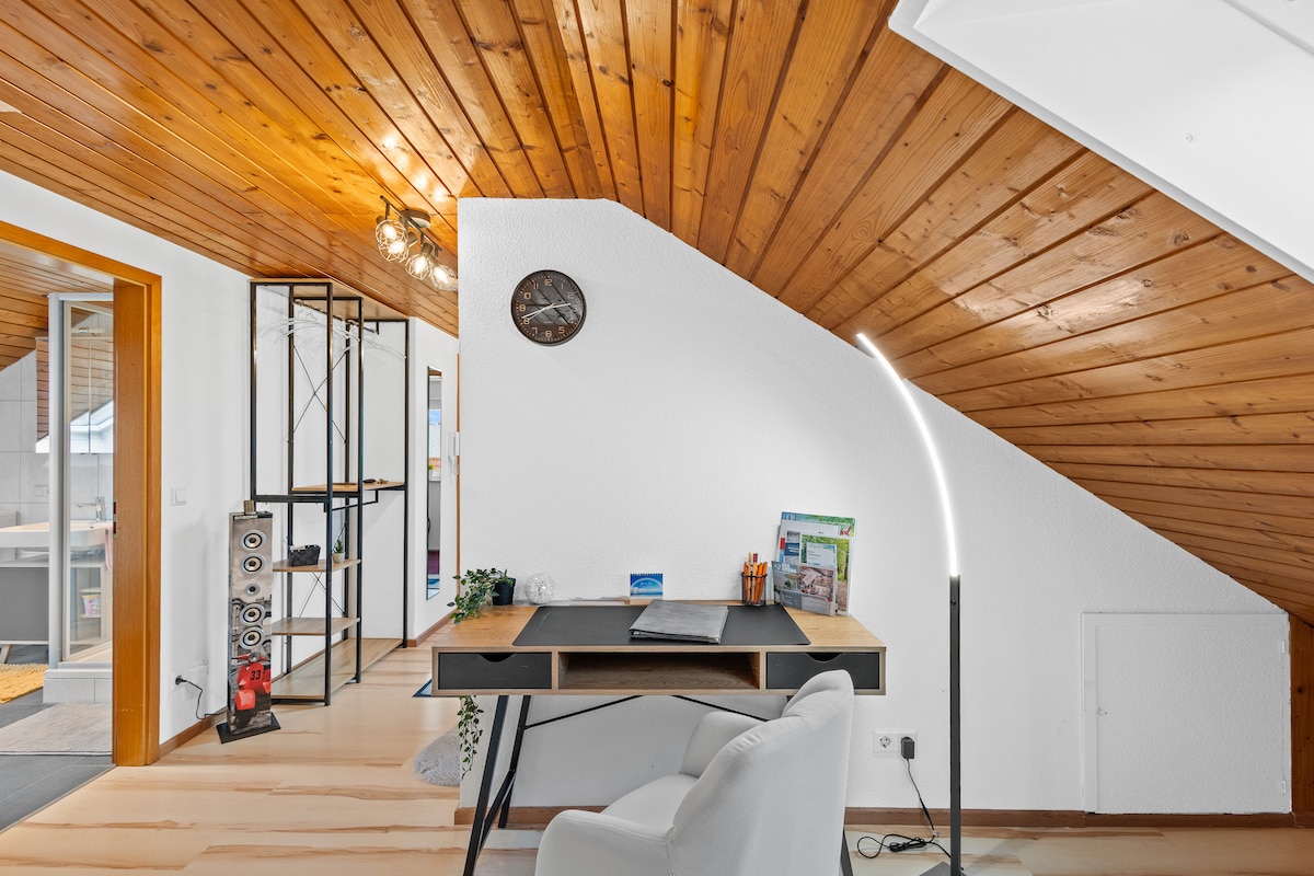 Надзвичайно красива 2 1/2-кімнатна квартира з унікальним видом на старе місто Біберах та Волків. Зручне помешкання з високоякісними дизайнерськими меблями. Велика кухня, повністю обладнана, включаючи посудомийну машину. Балкон з панорамним видом для ексклюзивного використання та зелена тераса на даху на південь для спільного використання. Кабельне телебачення, швидкий Wi-Fi 54 Мбіт. Дуже тихе та найкраще житлове розташування в сільській місцевості. 10 хвилин ходьби до міста, 5 хвилин до університету.