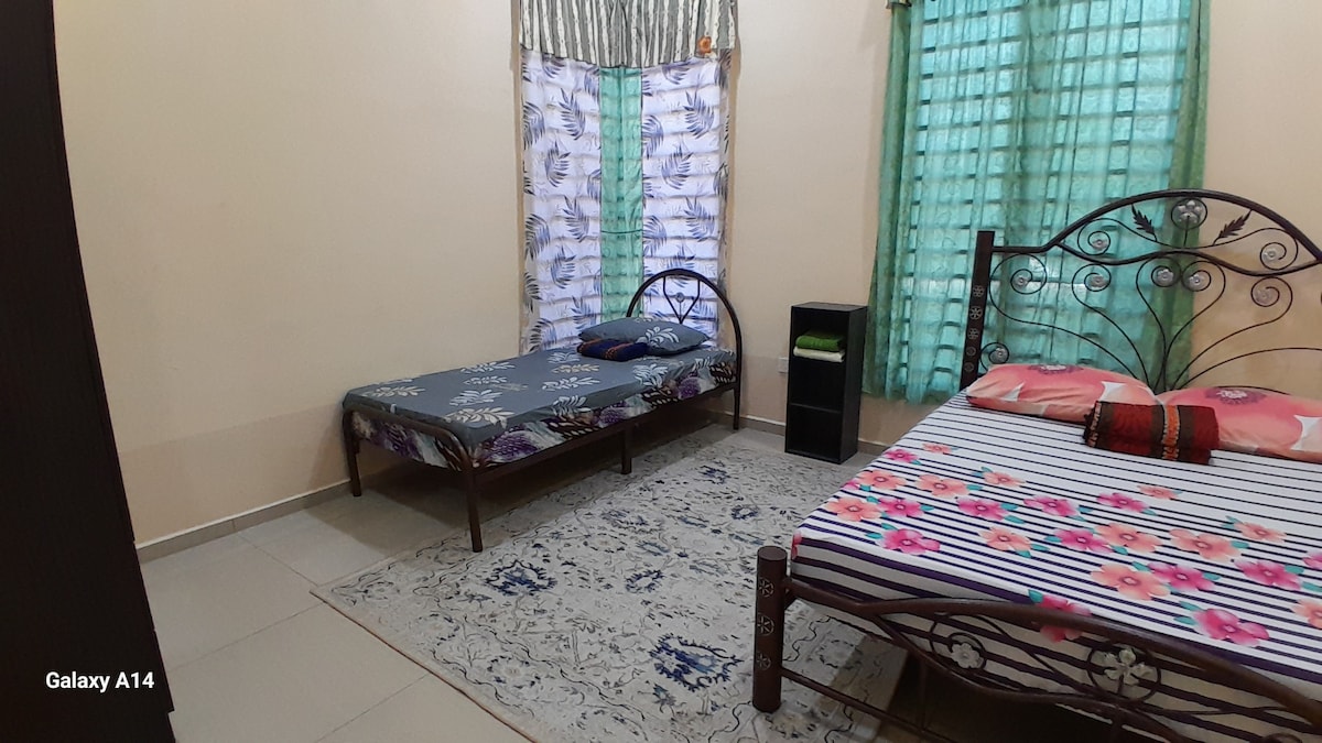 Що такого цікавого в нашому помешканні? - Майте 3 кімнати та 2 ванні кімнати. - Має 1 ліжко queen-size, 1 розкладне ліжко та 1 ліжко «диван-ліжко» - Кондиціонер у номері - Wi-Fi обладнаний - Телевізор із мультитрансляційною телевізійною коробкою. - 2 хвилини до громадського коледжу Масджид-Танах; - 4 хвилини до клініки Masjid Tanah Health Clinic. - 6 хвилин до міста мечеті Танах; - 12 хвилин до пляжу Пенгкалан-Балак;