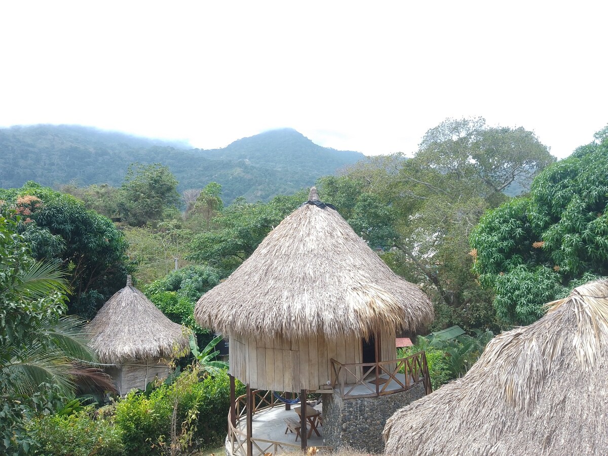 Ручна хатина, побудована з натуральних матеріалів у традиції Когуї. 1-й поверх - стіл, стільці та 2 гамаки для відпочинку + ванна кімната з туалетом. 2-й поверх - кругле спальне місце з двоспальним ліжком та двоярусними ліжками. У цьому просторому та спокійному помешканні є балкон із кріслами-гойдалками, де можна подивитися на нічне небо. Надається москітна сітка. Вхід до національного парку Тайрона, аптек, ресторанів та автобусних зупинок знаходиться в 5-10 хвилинах ходьби. Сніданок і прокат велосипедів доступні за запитом.