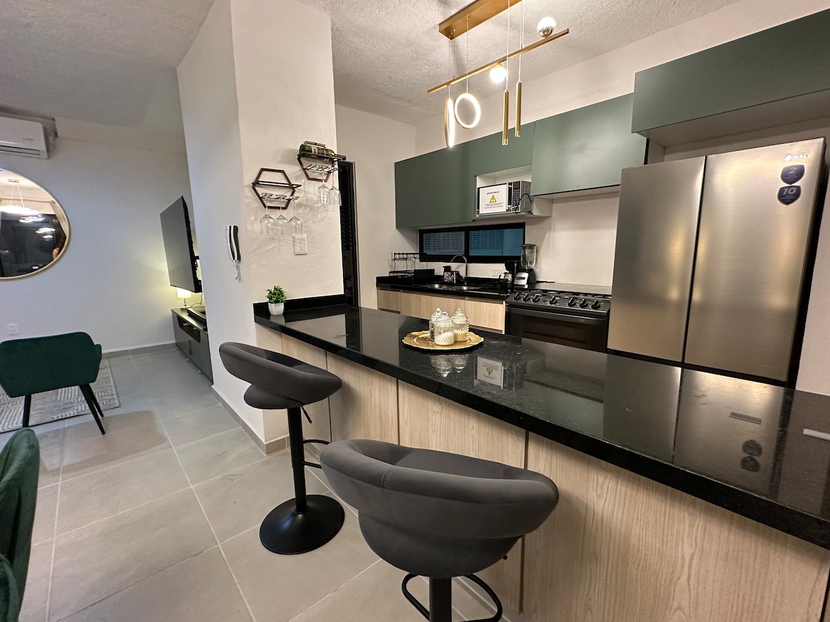 Насолоджуйтеся цією прекрасною квартирою з сучасним декором, що робить її дуже зручною. Перед квартирою ви можете насолоджуватися басейном і трьома барбекю на випадок, якщо захочете приготувати м 'ясо, дитячі ігри для своїх дітей, баскетбольний майданчик і фут. Басейн закривається по вівторках через технічне обслуговування. Район дуже тихий і безпечний, з цілодобовою охороною та безкоштовною парковкою для вашого автомобіля перед квартирою. Вона має 2 спальні з кондиціонером, вітальню, кухню, їдальню та патіо.
