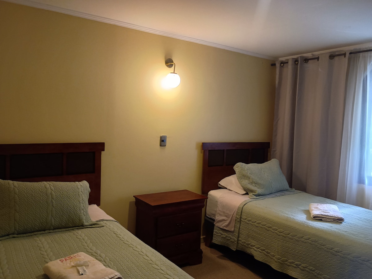 Комфортна кімната з окремою ванною кімнатою в хостелі Casa Mutrún, вміщує до 3 осіб. Затишне помешкання, комфортне, безпечне, чисте та в центрі міста. У нас є приватна парковка, Wi-Fi, простора вітальня та загальна їдальня. Він знаходиться всього в 3 кварталах від автовокзалу та знаменитої залізниці «Ель-Рамаль», в 4 кварталах від площі Армас і всього в 3 кварталах від великої річки Мауле. Хостел розташований поруч із міською виставкою вільної торгівлі, де можна придбати свіжі фрукти на сніданок