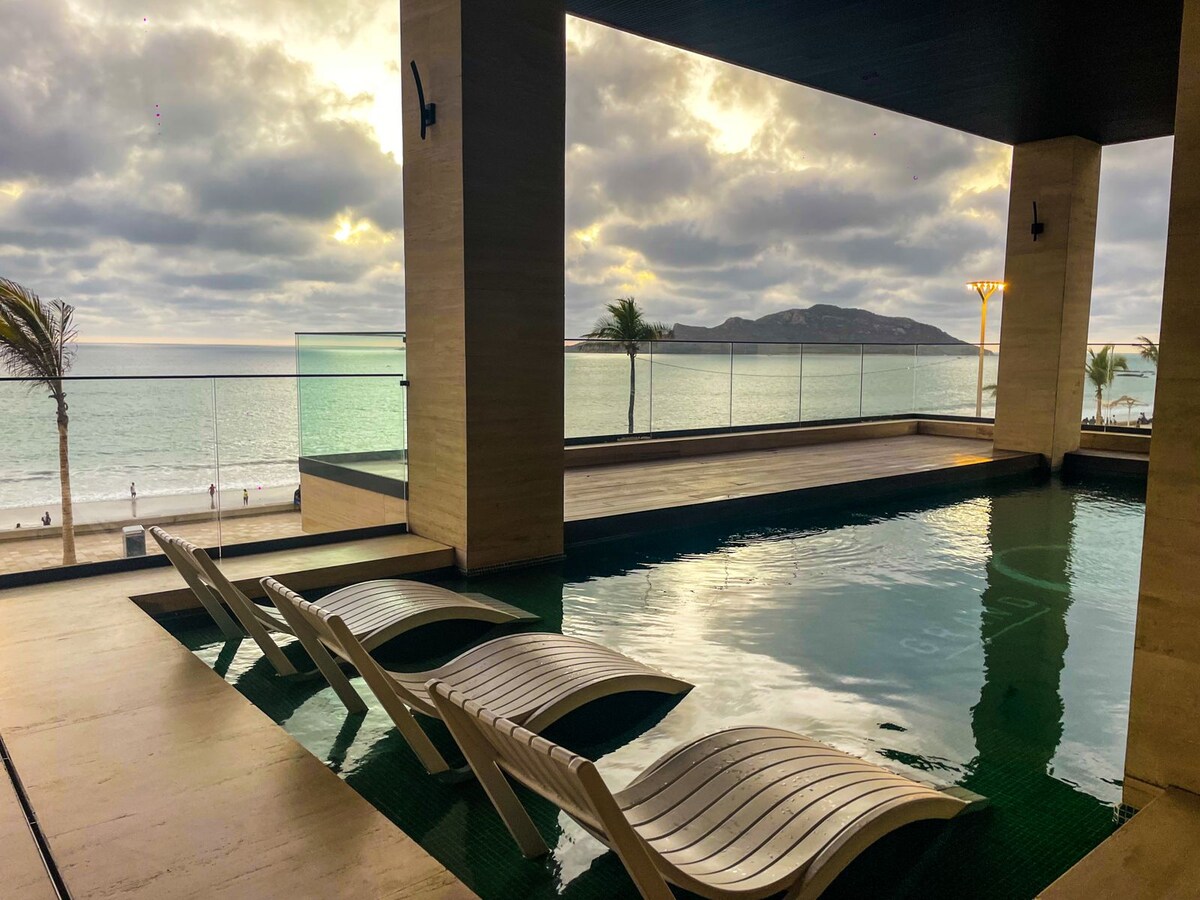 Wake up by the ocean at The Grand O Living, an elegant and cozy space designed to make you relax. Sunrise coffee on the terrace, golden sunsets from the living room. Located on the Malecón, just 50m from the beach, with a resort-style pool, gym and lounge areas. Ideal for couples and families seeking comfort and ocean views. 2 min to Mazatlán Letters 5 min to New Aquarium 4 min to Teodoro Mariscal Stadium