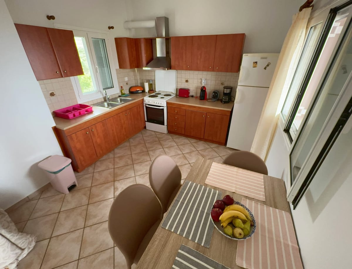 Просторий окремий будинок з великою терасою та безперервним видом на море. Вміщує до 4 гостей у двох спальнях (1 двоспальне ліжко та два односпальні). Усередині є кондиціонери, у вітальні та в обох спальнях. Усі вікна та французькі двері мають екрани. Кухня обладнана посудомийною машиною, кавоваркою еспресо, кавоваркою фільтрованої кави, тостером, чайником, мікрохвильовою піччю, холодильником та всім кухонним приладдям.